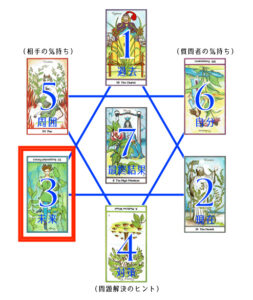 ヘキサグラムでは、下図の左側(3番)赤囲みカードが「未来」ですので、より意識的に占い結果を導くようにしてみましょう。